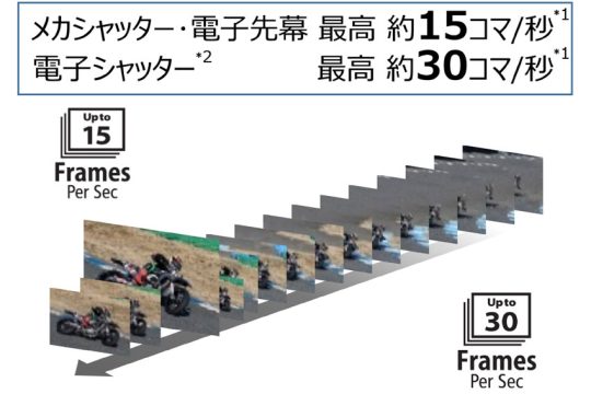 ●連続撮影速度:最高約15コマ/秒 (メカシャッター/電子先幕)、最高約30コマ/秒 (電子シャッター)