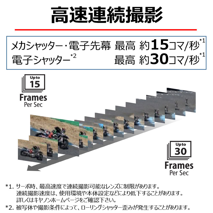 ●連続撮影速度:最高約15コマ/秒 (メカシャッター/電子先幕)、最高約30コマ/秒 (電子シャッター)