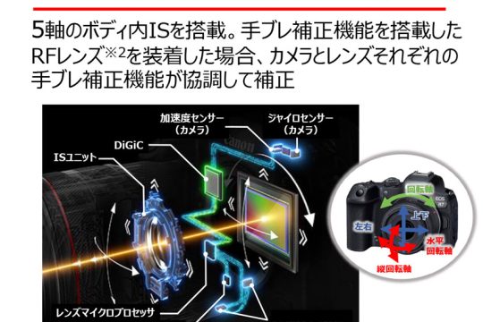 ■ボディー内手ブレ補正機構を搭載。レンズ内光学式手ブレ補正との協調制御、動画電子ISなど静止画、動画ともに強力な手ブレ補正が可能